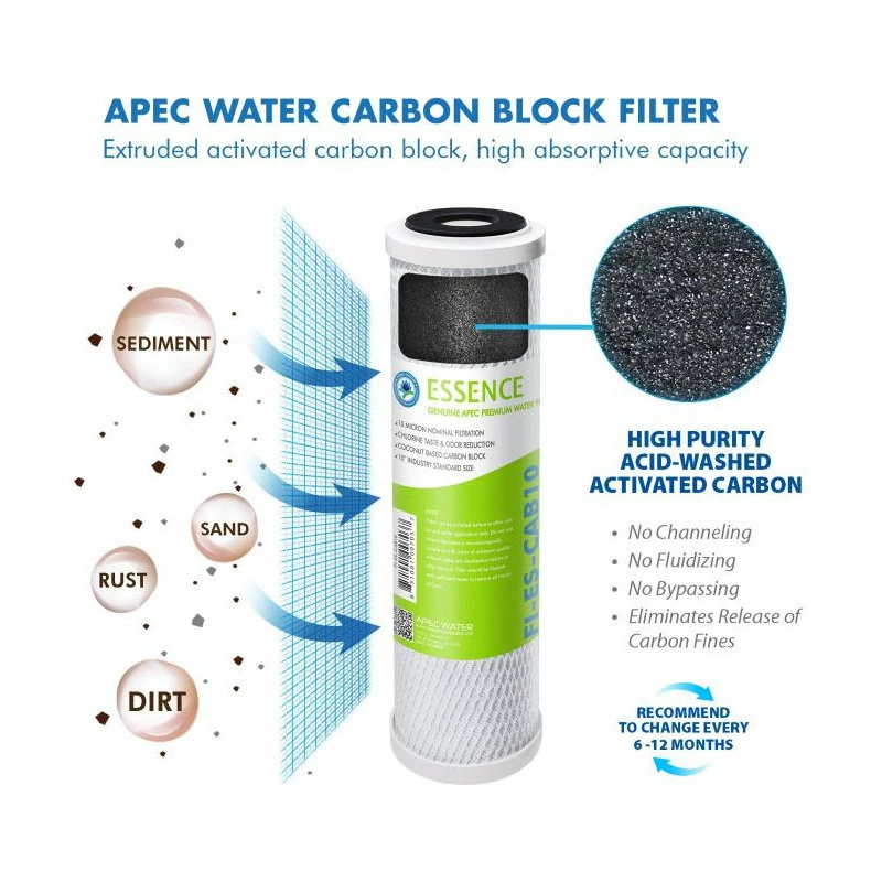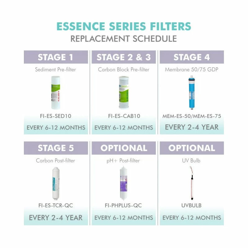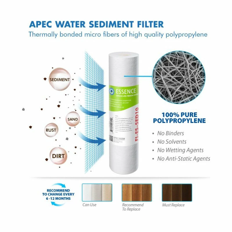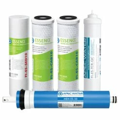 APEC Essence 5 stage complete filter set is made with high quality filtration components to protect and prolong the lifespan of your reverse osmosis system. Premium quality filter set lasts over 6 months for high performance contaminant removal, while the membrane and post carbon filter last 2-4 years. These standard size filters are compatible with APEC 50 GPD Essence and all other 10″ standard size under counter reverse osmosis systems.