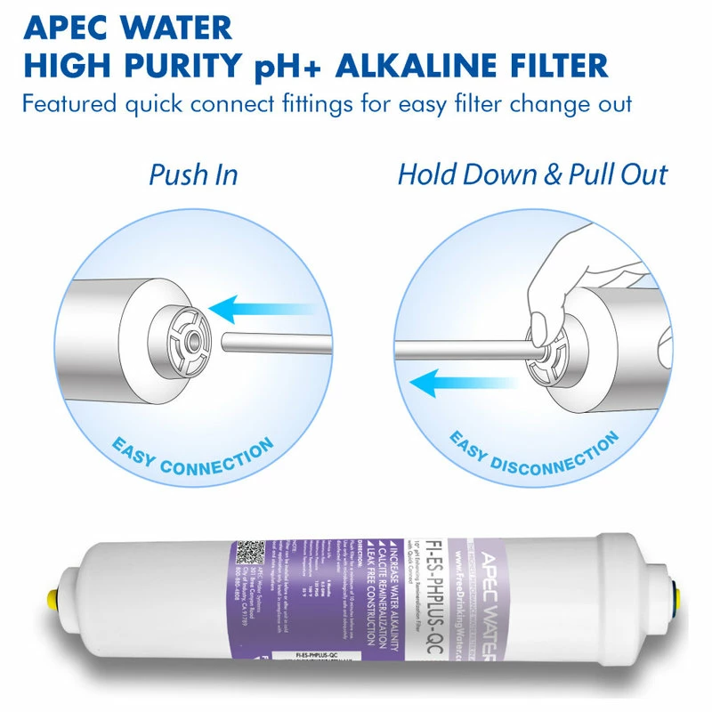 APEC Essence 75 GPD pH 6 stage complete filter set is made with high quality filtration components to protect and prolong the lifespan of your reverse osmosis system. Premium quality filter set lasts over 6 months for high performance contaminant removal, while the membrane and post carbon filter last 2-4 years. The 6th stage pH+ inline filter enhances the pH of water and adds food grade quality calcium carbonate into the water. These standard size filters are compatible with APEC Essence ROES-PH75 under the counter reverse osmosis systems and all other standard size under counter reverse osmosis systems.