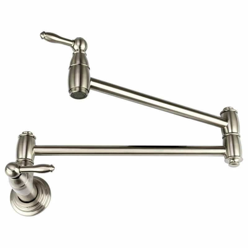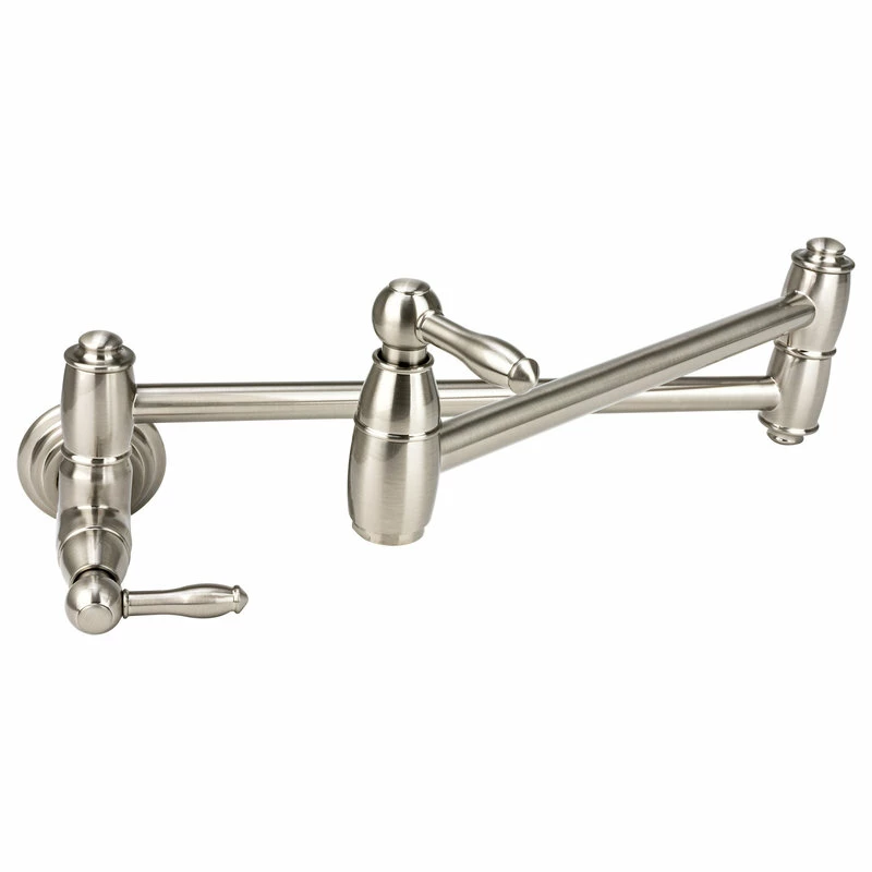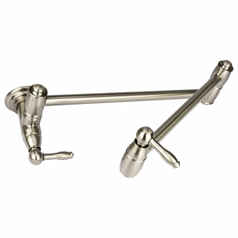 Pamper the chef in your family with this durable traditional kitchen pot filler faucet from “Brienza by Italia” in brushed nickel finish. Pot filler faucets allow you to fill large pots and kettles directly on the stove, decreasing the need to carry heavy pots full of sloshing water across the kitchen. This faucet features the convenience and safety of two valve controls and an articulated arm that extends to maximum spout reach of 22.5 inches. Faucet is heavy duty, made from solid, “no-lead” brass.