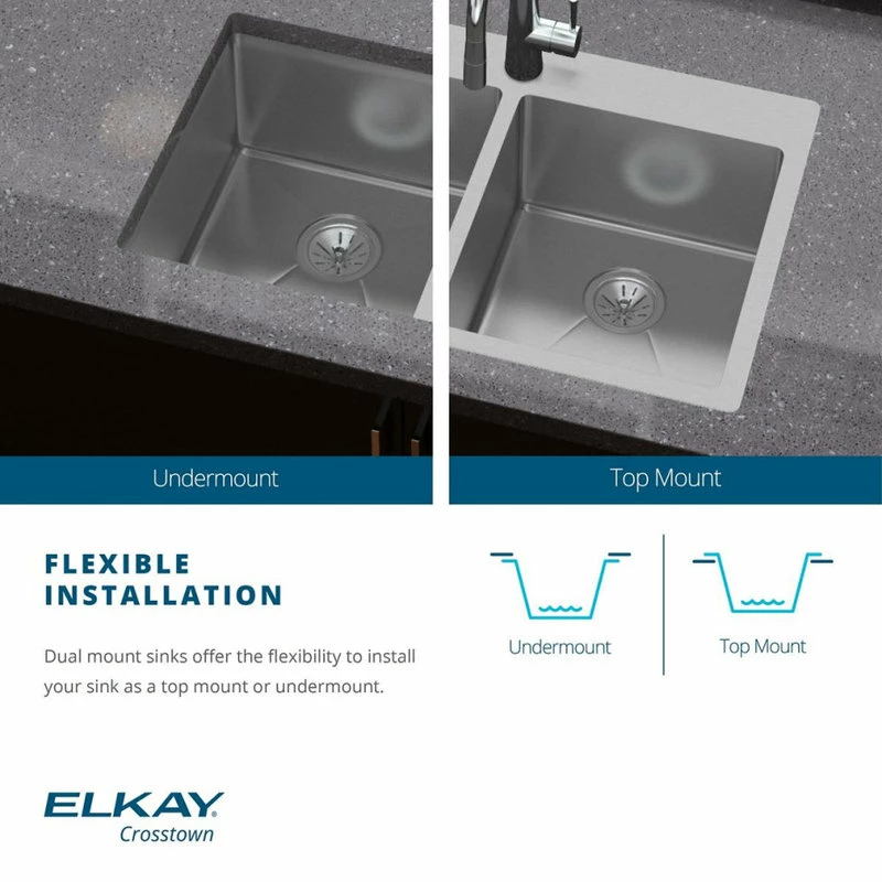 The Elkay Crosstown collection offers a fresh take on the classic stainless steel sink, combining beauty, function and contemporary design. Tight corners and a flat bottom provide more space inside the sink bowl for stacking and cleaning dishes. The striking geometric shape makes a statement in any home.