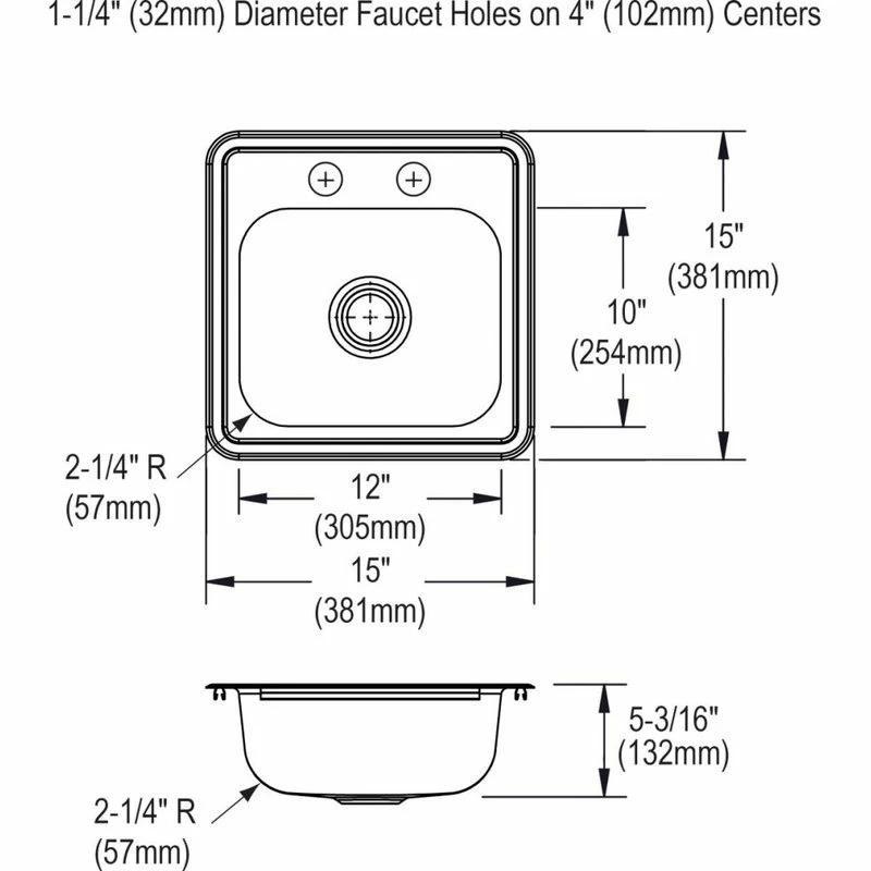 - CENTER DRAIN: Drain is conveniently placed in the center of the sink.