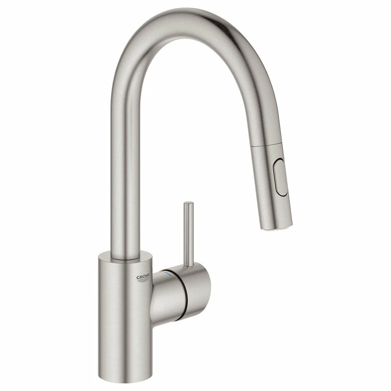 The GROHE Concettoโข Dual Spray Pull-Out Kitchen Faucet is sleek, sophisticated and engineered for superior performance. Convenient pull-out spray easily toggles between regular water flow and spray for maximum versatility for every kitchen task. Meticulously crafted with a high, swivel spout for ease when filling pots, and lever handle that offers precise control of water pressure and temperature. Available in durable GROHE StarLightยฎ finishes for lasting beauty.