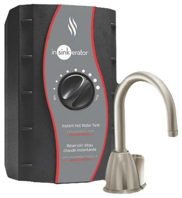 - Includes satin nickel finish instant hot water dispenser and unique Hot100 2/3 gallon stainless steel hot water tank