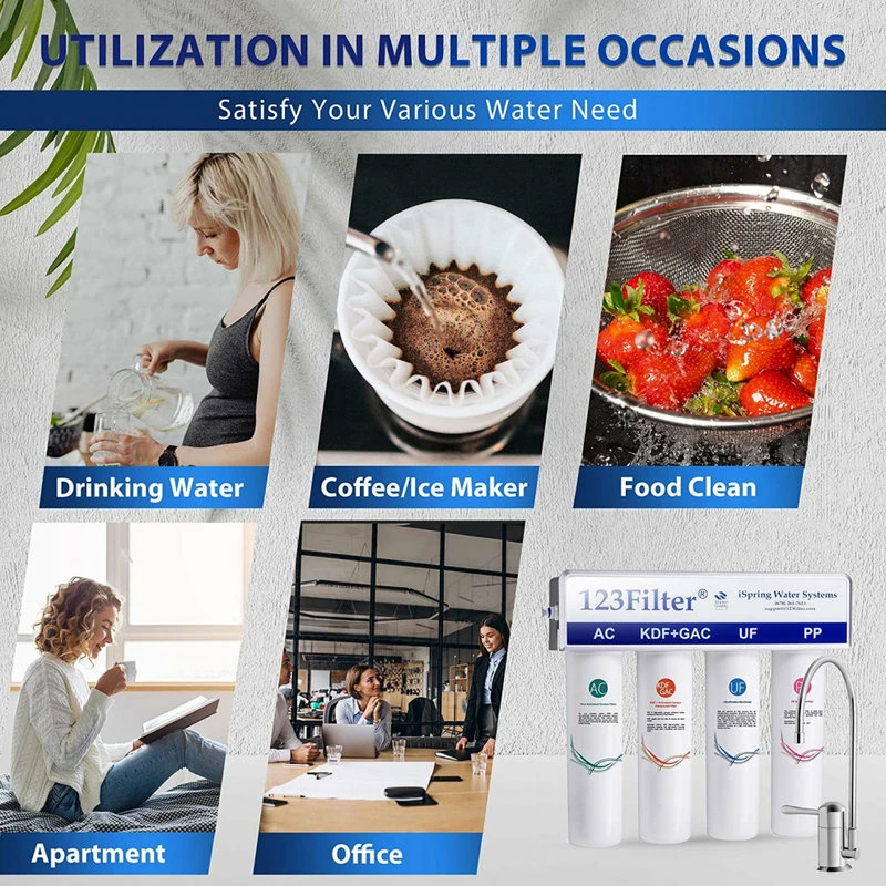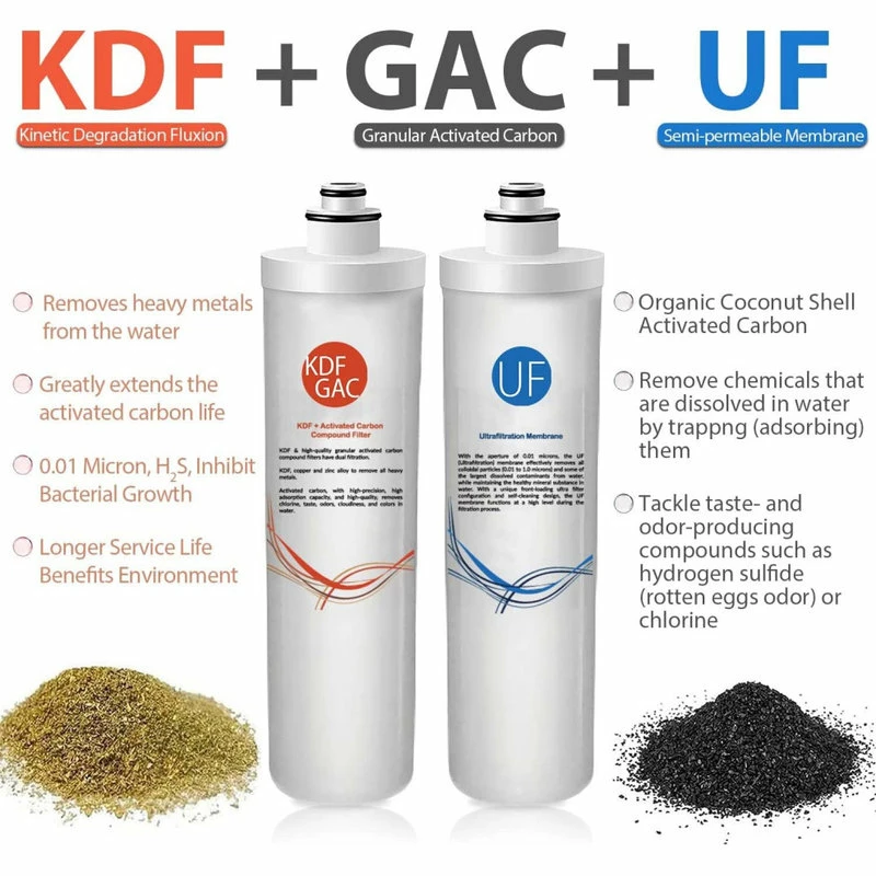 4-Stage Filter Replacement Pack: PP Sediment Filter ((5 microns) removes larger particles like rust, sand and dirt.) Ultra Filtration Filter (contains hollow fiber membrane technology with a pore size of just 0.1 micron.) KDF and GAC Filter (provides much better control of particularly problematic contaminants including chloramine, hydrogen sulfide, metals, and other organic compounds.) Fine Activated Carbon Filter (provides final polishing before the purified water).