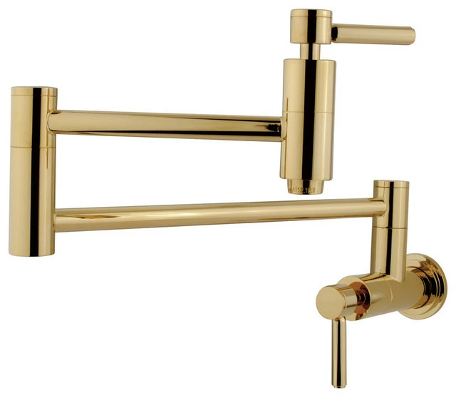 The Concord pot filler is a sleek cylindrical faucet that is convenient and easily manageable when working in the kitchen. The filler includes a swing-arm spout that extends 21-1/2″ with its double jointed reach for washing large pots and pans. The design is sleek and made from solid brass with its durable construction and available in a variety of finishes. The faucet is easy to install with its single hole wall mount installation and accommodates well with other contemporary decor.