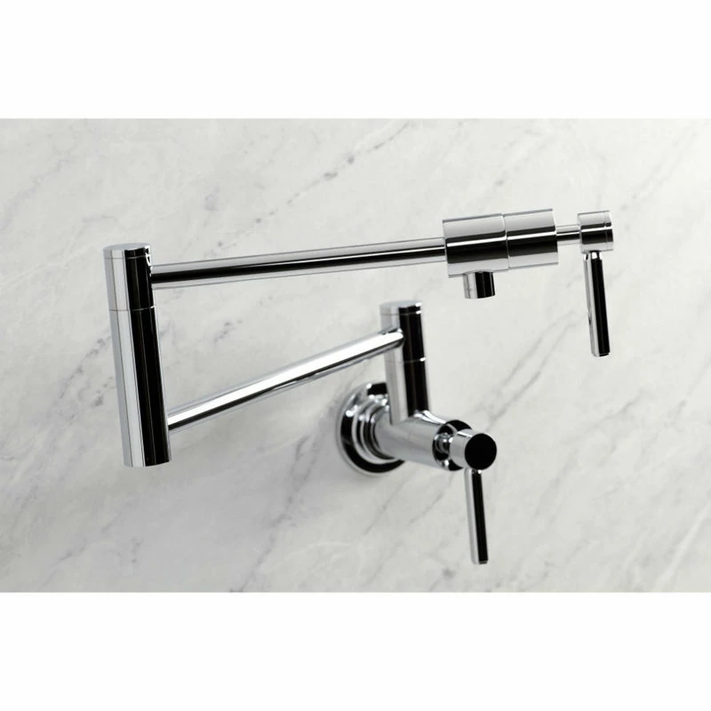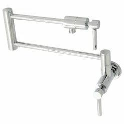 This faucet boasts bold, sleek design with its cylindrical styling. As an excellent tool to quickly, easily, and stylishly fill pots, eliminate strain on your joints. Pot-fillers are useful gadgets placed directly above the stove, providing easily accessible water. The foldable swing arms of this pot filler allow for extendable reach of up to 21.5-inch of length and provide long-lasting function due to their sturdy brass construction. Additionally, the dual handles prevent unwanted water spillage while enhancing the modern theme.