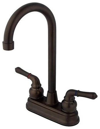 This double handle centerset high-arch bar faucet features a transitional look that offers a new way for lovers of traditional and modern style to coordinate their kitchen. The faucet provides a two-hole sink application and a 1/4-turn on-and-off mechanism for controlling the flow of water. The item is fabricated in high-quality brass and is crafted to ensure years of reliable performance; also comes in a variety of finishes to allow you options when creating/improving your bar setting.