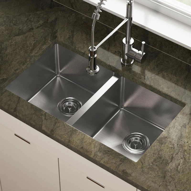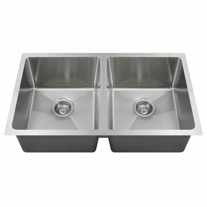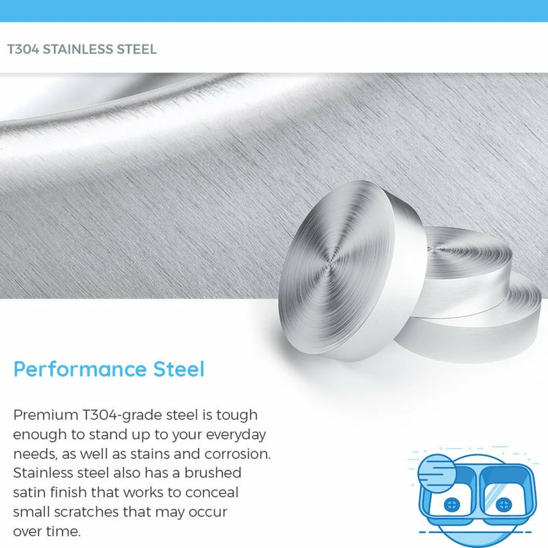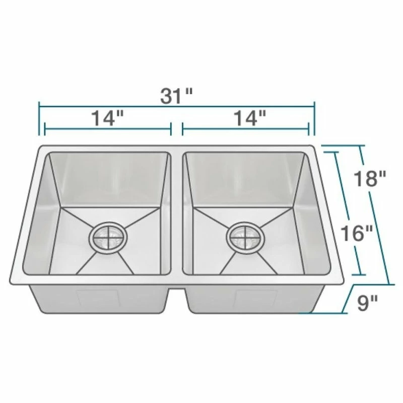 The equal-sized bowls of this stainless steel workhorse allow plenty of room for any chore to be divided and handled with ease. Its three-quarter inch radius corners provide maximum interior space. This model is 304-grade, cold rolled steel, at a 16-gauge thickness; 25% thicker than the industry standard 18-gauge. The surface is given a brushed-satin finish which adds to its luster and masks minor scratches which could occur over time. Dense, sound-dampening pads and an insulation coating are applied to the underside. With an overall measurement of 31″ x 18″ x 9″, it will require a minimum-width cabinet of 33″. It is cUPC certified. This listing does not include any accessories.