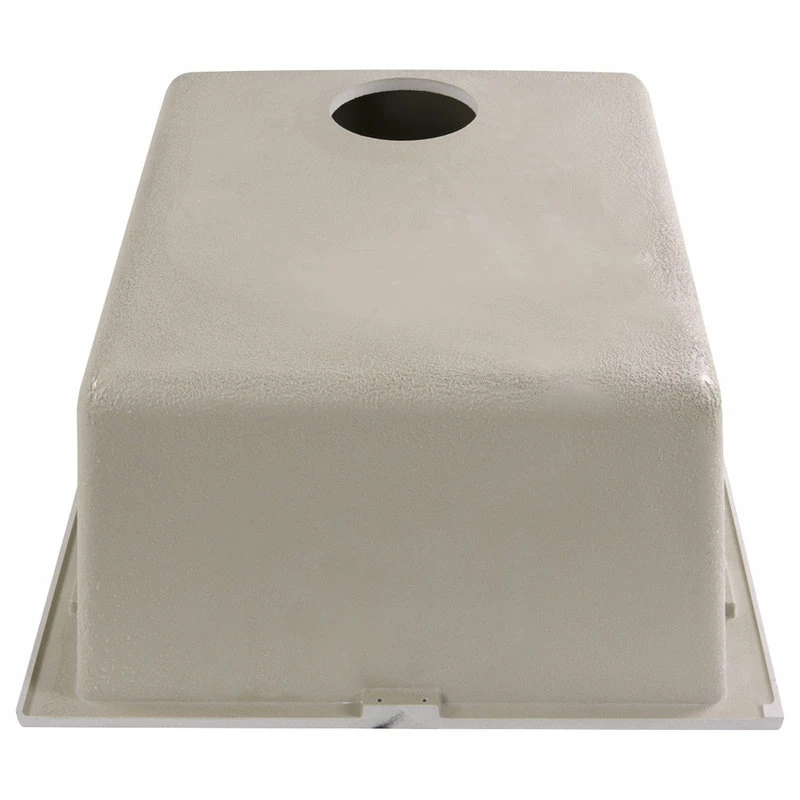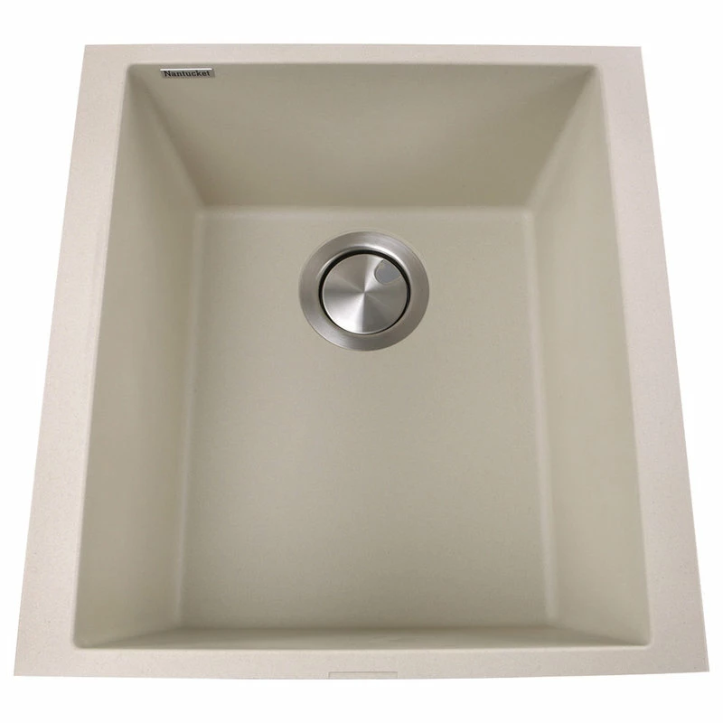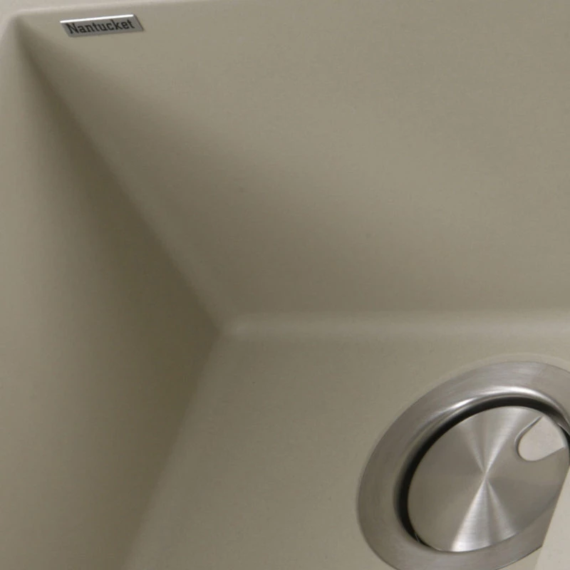 Nantucket Sinks’ Italian granite composite sinks are a new discovery as part of our Plymouth Collection. This 17 inch single bowl undermount is just the right for a bar or prep sink. With benefits long known to design professionals, this sink is 80% natural stone which helps it to be both resistant to stains and scratches. The nonporous surface is hygienic and helps to ward off microbes. Because of its material composition, it can withstand thermal shocks and temperatures up to 560 degrees Fahrenheit. The rear placement of the drain provides you with more under counter space for storage. Stone is naturally sound-absorbing for a quieter kitchen. Practical and beautiful neutral sand color.