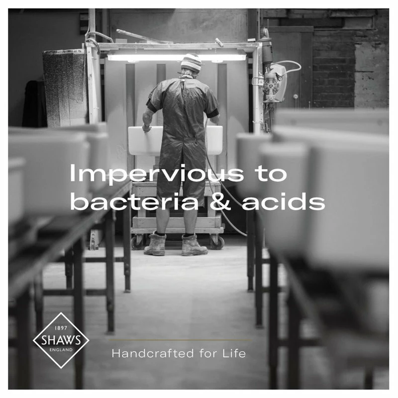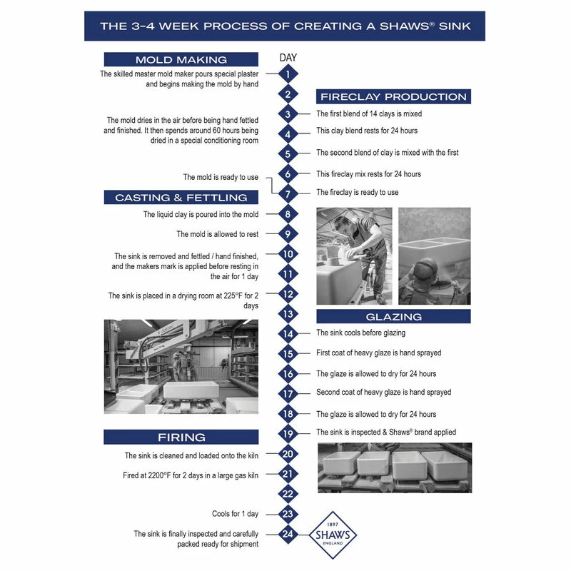 In 1897, the apron front sink was introduced by Shawsยฎ of Lancashire, England. Today, every Shawsยฎ Original Fireclay Sink is still hand poured, shaped and stamped with the name of the very artisan who crafted it. Taking over three weeks to create, more clay, more glaze, more heat and more care breathe character into products made by real people. Every Shawsยฎ sink is unique and designed to last a lifetime.Shaws RC1515 Features: