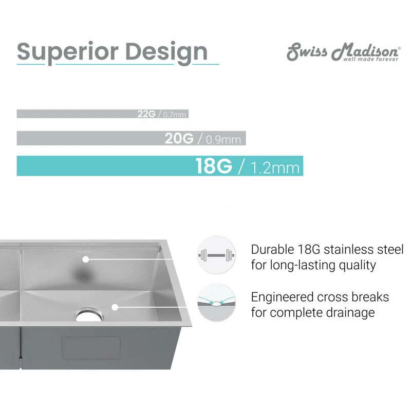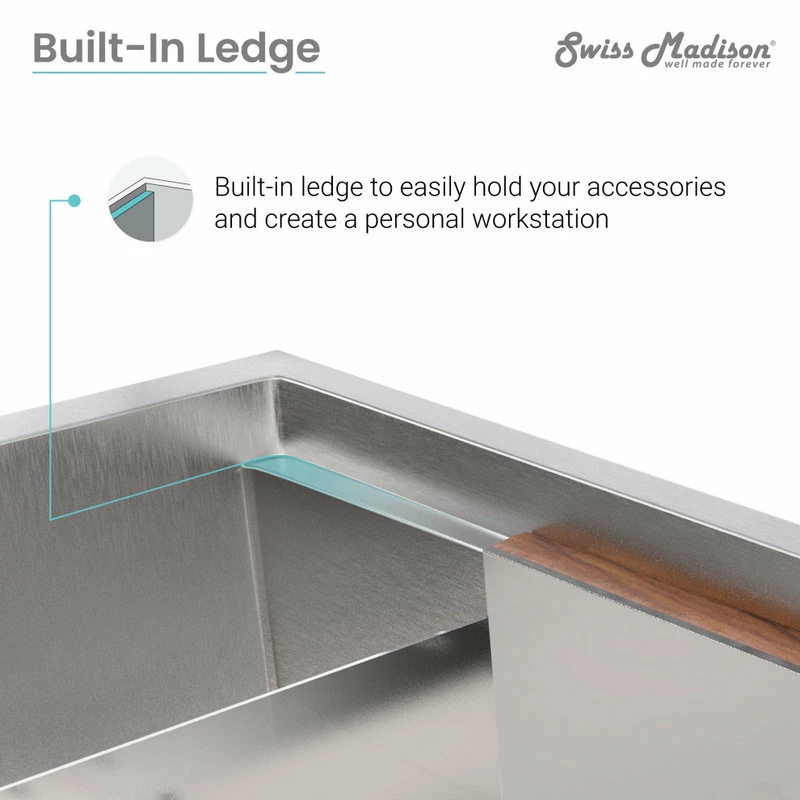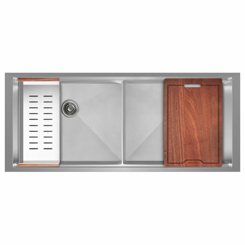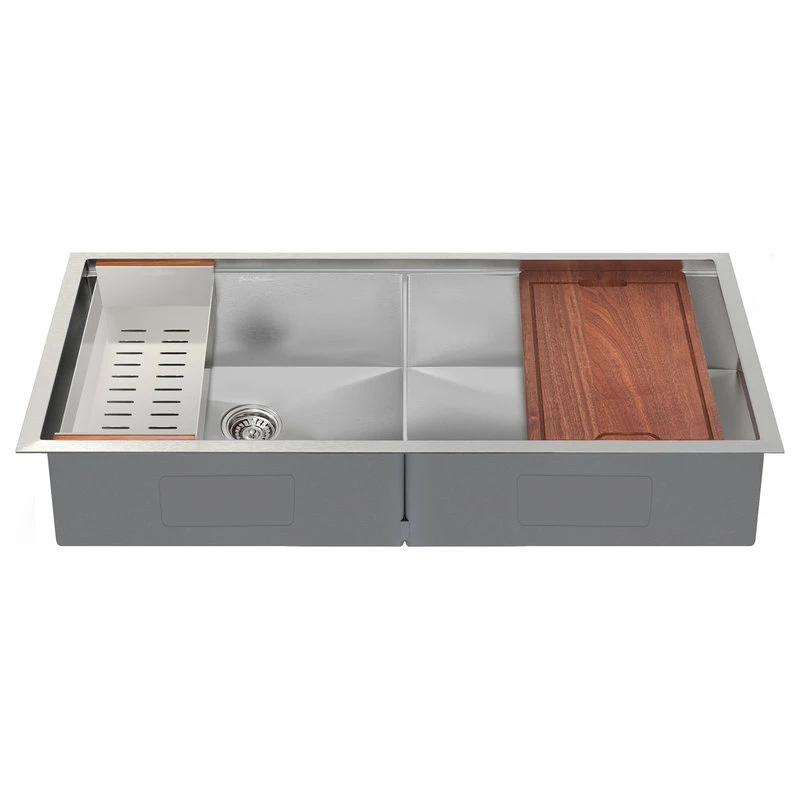 This Rivage Workstation Sink is the ultimate modern addition to any kitchen setting. From meal prep to cleanup, this stylish undermount dual basin set comes with a strainer, colander, and cutting board, making your kitchen a streamlined workspace. Crafted with stainless steel, this product is durable and built to last. The deep bowl allows for uninterrupted space in washing and stacking dishes, along with other household tasks. Additionally, this product is stain and scratch resistant, along with being engineered to withstand high temperatures.