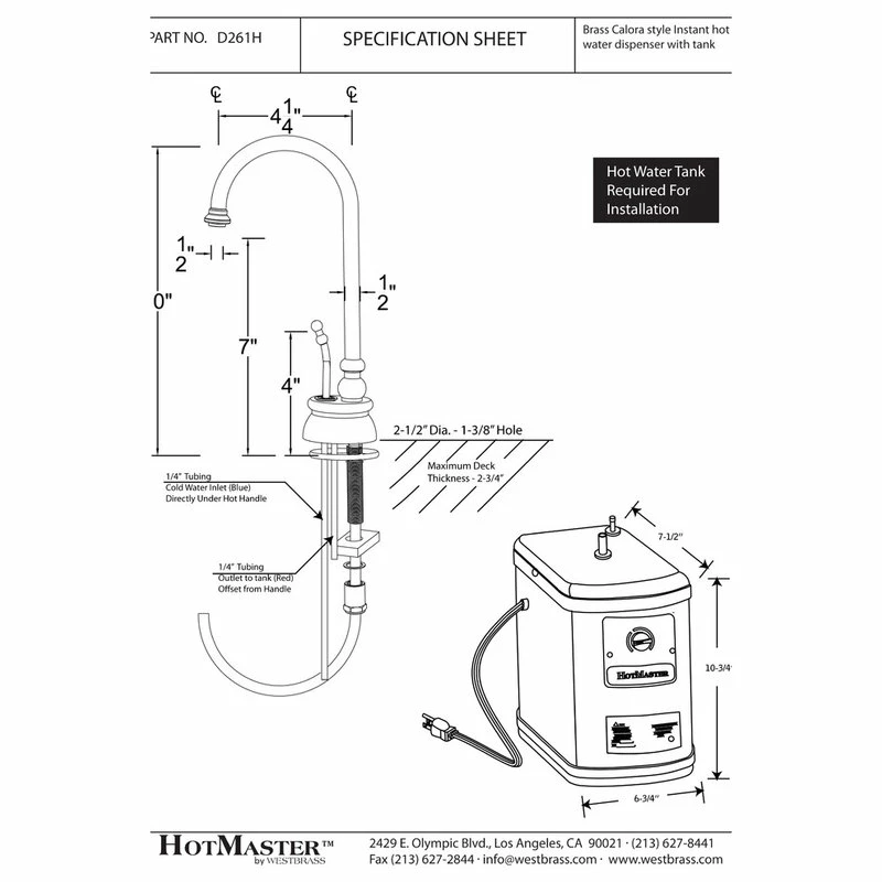 The Westbrass Calorah Single-Handle Hot Water Dispenser Faucet Kit with tank, offers quick and easy water control and its single handle automatically turns off hot water for your safety. The faucet features a high-arc spout for an attractive appearance. A QHT 1300W instant hot water tank, plugs into 120V and is included with this faucet. Mounting materials are included for convenient, single-hole installation.